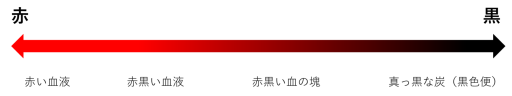 だだ、十二指腸で勢いよく出血しているケースでは、黒くなる前に肛門まで赤い血液のままで到達することがありますので、色だけで判断することは要注意です。このような場合は貧血症状が出ますので、色だけではなく症状など総合的に判断が必要です。